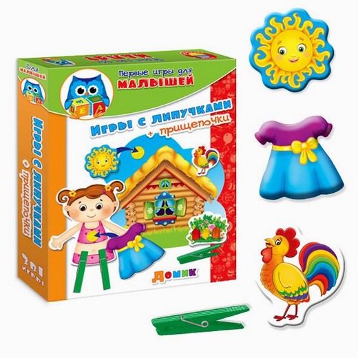Игры с прищепками "Домик"- это отличный тренажер для развития мелкой моторики рук и внимания малыша. В наборе - три игры для малышей. Их уникальность в том, что процесс игры и обучения основан на дополнительных интересных материалах - фигурных деталях из плотного картона, прищепках и вжик-липучках (при отстегивании создают смешной звук, который очень нравится детям)!