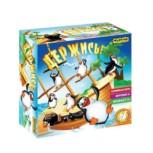 Настольная игра Держись – веселая игра на ловкость (аналог известной настольной игры « Не раскачивай лодку). Игрокам предстоит выставлять пингвинов на качающийся корабль. Главная задача игроков - не уронить пингвинов в воду и не опрокинуть корабль.