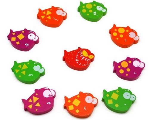 · 9 больших деревянных рыбок - по 3 синих, зеленых и оранжевых