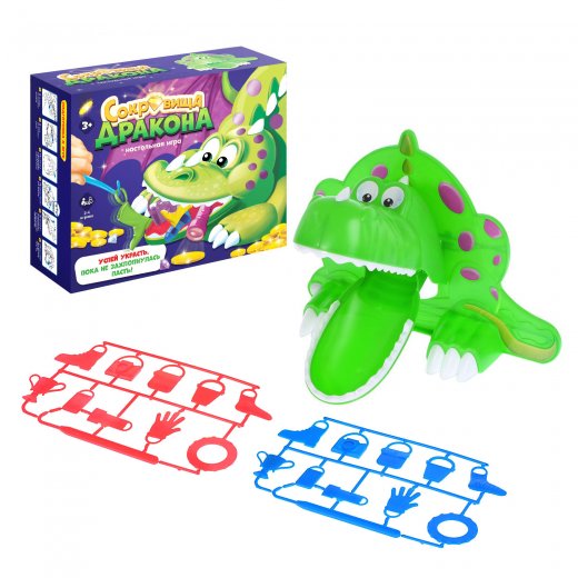 Первым ходит самый младший участник. Аккуратно доставайте предметы, цепляя их крючком шпажки за петельки. Но осторожно! Не заденьте зубы дракона! Иначе его пасть захлопнется, и он проглотит все сокровища.
