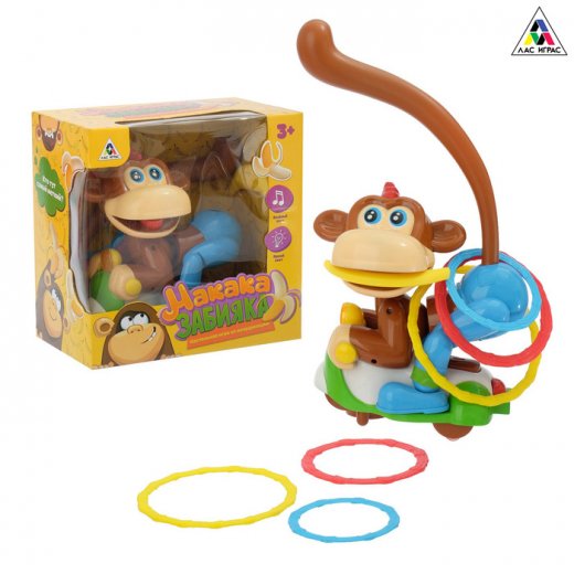 Если игроков несколько, то по команде они начинают хватать по одному колечку и закидывать их обезьянке на хвостик. Колечки разные по размеру, так что закидывать их будет не всегда легко!