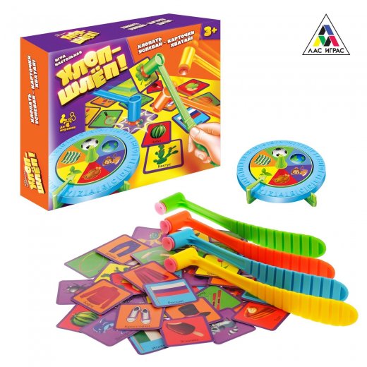 Настольная игра "ХлопШлеп" – увлекательная игра для всей семьи! Крутите барабан и хватайте молоточками с присосками подходящие карточки! Выигрывает самый быстрый и ловкий – тот, кто соберет карточек больше всех. А с дополнительными карточками игра станет еще интереснее!