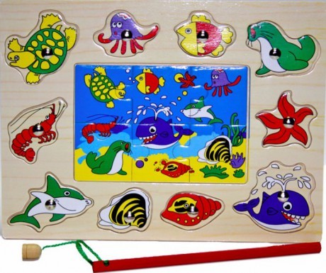 Игра "Рыбалка с пазлами"- это увлекательная игра с удочкой на магнитах. В комплект данного набора входит деревянный планшет, на котором по середине расположен пазл из 6 элементов. Вокруг пазла находятся вкладыши- фигуры водных обитателей (черепаха, осьминог, рыба, тюлень, морская звезда, дельфин, акула, ракушка, улитка, рак). К набору прилагается одна удочка.