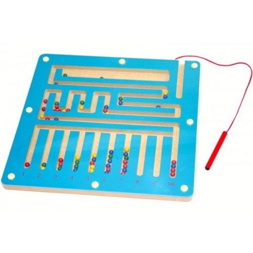 "Магнитный лабиринт со счетом до 10" - увлекательная головоломка, которую ваш ребенок будет решать ни один вечер. Магнитный лабиринт состоит из деревянного красочного основания с множеством ходов-лабиринтов. К лабиринту прикреплена палочка с магнитом на конце. При помощи палочки с магнитом на конце ребятам предстоит заполнить специальные ячейки, подписанные числами от 1 до 10 шариками в соответствии с указанным количеством. Для того чтобы шарики случайно не выпали, сверху лабиринт покрыт прозрачной пластмассой. Палочка надежно примагничивает выбранный шарик через прозрачную крышку и легко проводит его по извилистым лабиринтам головоломки. В зависимости от возраста, опыта и количества участников веселого соревнования можно придумать массу интересных заданий. Например, предложите перенести все шарики в лабиринт цифры 5 или рассортировать шарики по цветам, оставив желтые магниты в домике цифры 3, синие в домике 7, зеленые в 6, а красные, отправив в домик под номером 1. По мере освоения навыков игры с лабиринтом можно усложнять задания, выполняя их на время