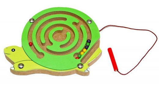 "Магнитный лабиринт малый в ассортименте" - головоломка для самых маленьких. Магнитный лабиринт в форме желтой рыбки (зеленой черепашки, красной божьей коровки, белой улитки, ярко-желтой звездочки), представляет из себя деревянную доску с множеством ходов-лабиринтов. К лабиринту шнурками прикреплена палочка с магнитом на конце. Внутри лабиринта находятся разноцветные металлические шарики, которые можно передвигать по ходам-лабиринтам при помощи палочки. Для того чтобы шарики случайно не выпали, сверху лабиринт покрыт прозрачной пластмассой. Палочка надежно примагничивает выбранный шарик через прозрачную крышку и легко проводит его по извилистым лабиринтам головоломки.