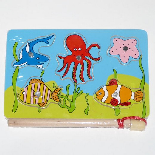Игра "Рыбалка"- это увлекательная игра с удочкой на магнитах. В комплект данного набора входит деревянный планшет, с изображением аквариума, удочка с магнитом и 5 фигурок морских обитателей. На каждой фигурке установлен магнитик. Задача ребенка, вооружившись удочкой выловить всех жителей аквариума. Затем установить их на рамку в вырез соответствующей формы. Магниты на удочках сильные, поэтому рыбки не сорвутся с крючка. Играть могут одновременно два человека, что добавляет азарта. Все детали игрушки изготовлены из экологически чистой древесины, не токсичны, аккуратно обработаны по краям и абсолютно безопасны для детей.