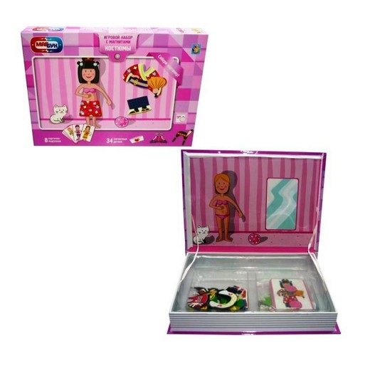Игровой набор с магнитами "Костюмы"- интереснейший развивающий фантазию игровой набор.  Игровой набор сделан в виде книги, внутри которой вы найдете 8 карточек-подсказок с изображением человечков в национальных костюмах разных народов и на разные случаи жизни, и 34 магнитных деталек, из которых нужно собрать готовые картинки персонажа в определенном костюме, прикрепляя их на раздетого человечка, нарисованного на обложке-крышке с металлической основой внутри. При игре можно как ориентироваться на подсказки в наборе, так и создавать свои собственные шедевры.