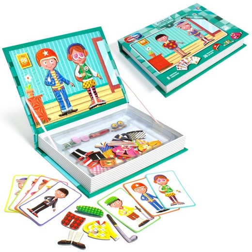 Игровой набор с магнитами "Мальчик и девочка"- великолепный подарок для маленькой модницы. Игровой набор сделан в виде книги, внутри которой вы найдете 8 карточек-подсказок с изображениями разных образов и нарядов для парочки - девочки и мальчика, и 36 магнитных деталек, из которых нужно собрать готовые картинки персонажей в одежде, прикрепляя их на раздетых человечков, нарисованных на обложке-крышке с металлической основой внутри. При игре можно как ориентироваться на подсказки в наборе, так и создавать свои собственные шедевры.