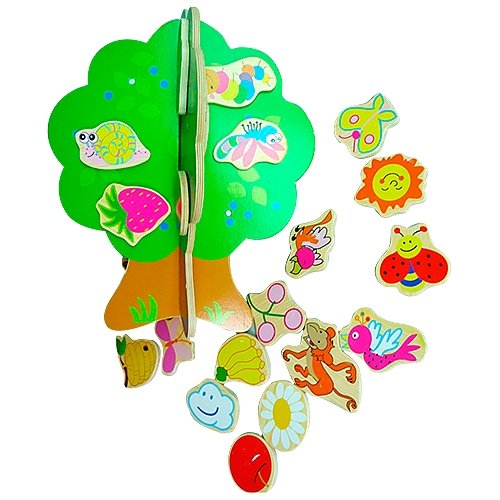 "Магнитное дерево" - это познавательная игрушка для развлечения и обучения малыша. Дерево собирается из двух половинок и дальше Вы с ребенком можете посадить на дерево бабочек, а может пчелы сделали на нем свой улей. А еще в листве может спрятаться солнышко или сова, а на дереве могут расти фрукты. Все фигурки, а их 24 штуки, животных, плодов и прочее деревянные, очень крупные, по-этому с игрушкой могут играть совсем маленькие дети.
