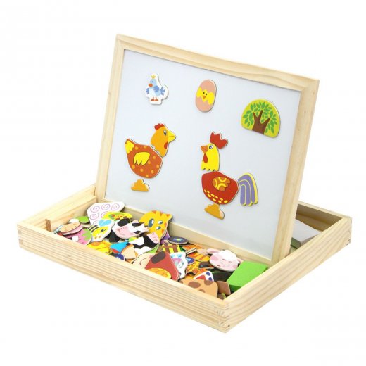 "Доска двусторонняя магнитная" сможет стать для ребенка не только хорошим развлечением, но и средством для его развития. Одна из сторон доски магнитная и представлена в белом цвете. На магнитной (белой) стороне этой доски ребенок будет тренировать свое воображение, конструировать различные сюжеты и картинки по заданному шаблону-инструкции. Со временем ребенок научится комбинировать детали без инструкции, лишь с помощью собственного воображения.