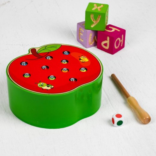 Магнитная рыбалка "Спелое яблочко" - веселая игра для малышей от 1,5 лет. В комплекте деревянная основа в форме яблочка, в нем 10 дырочек, в которых прячутся 10 разноцветных червячков с магнитными головками, кубик и "волшебная" палочка, тоже с магнитным наконечником. Червячки пяти цветов (каждого цвета по паре). Задача простая: с помощью магнитной палочки нужно поймать всех червячков, а потом посадить их обратно в норки. Это не так просто, как кажется, и требует большой сосредоточенности и меткости.