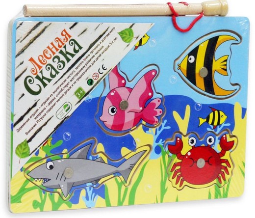 Деревянная игра "Рыбалка"- это увлекательная игра с удочкой на магнитах. В комплект данного набора входит деревянный планшет, с изображением аквариума, удочка с магнитом и 5 фигурок морских обитателей. На каждой фигурке установлен магнитик. Задача ребенка, вооружившись удочкой выловить всех жителей аквариума. Затем установить их на рамку в вырез соответствующей формы. Магнит на удочке сильный, поэтому рыбки не сорвутся с крючка. Играть могут одновременно два человека, что добавляет азарта. Все детали игрушки изготовлены из экологически чистой древесины, не токсичны, аккуратно обработаны по краям и абсолютно безопасны для детей.