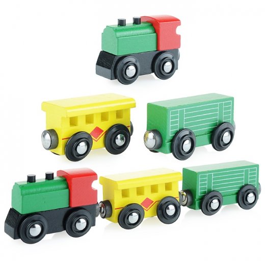 Набор состоит из двух вагонов и поезда (вагончики между собой крепятся магнитами), поэтому их можно переставлять местами, отцеплять, ставить на запасные пути. Все они сделаны из дерева, хорошо окрашены, не имеют острых углов. С помощью набора ребенок сможет разыграть массу игровых сюжетов.