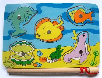 Игра "Рыбалка"- это увлекательная игра с удочкой на магнитах. В комплект данного набора входит деревянный планшет, с изображением аквариума, удочка с магнитом и 5 фигурок морских обитателей. На каждой фигурке установлен магнитик. Задача ребенка, вооружившись удочкой, выловить всех жителей аквариума. Затем установить их на рамку в вырез соответствующей формы. Магнит на удочке сильный, поэтому рыбки не сорвутся с крючка. Играть могут одновременно два человека, что добавляет азарта. Все детали игрушки изготовлены из экологически чистой древесины, не токсичны, аккуратно обработаны по краям и абсолютно безопасны для детей.