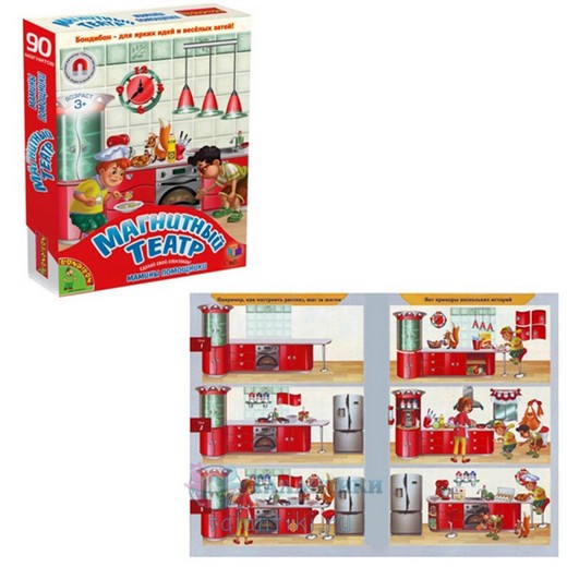 «Мамины помощники» — оригинальный магнитный театр, позволяющий разыгрывать множество миниатюрных спектаклей без дополнительного реквизита. Для самых маленьких режиссеров предложено несколько заданий – необходимо расставить предметы-магниты на игровом поле в точном соответствии с заданной картинкой. Дети постарше могут не только выполнять занятия по картинкам, но и самостоятельно придумывать сюжеты для спектаклей. В комплекте находятся магниты, олицетворяющие массу различных предметов (продукты, блюда, кухонная утварь и даже фигуры людей). Действия всех спектаклей происходят дома: детям необходимо помочь маме приготовить вкусный ужин или убрать свою комнату. Но кто знает, что может случиться в процессе уборки или готовки? Действия спектакля ограничены только фантазией ребят. Внимание: детям в возрасте до трех лет рекомендуется использовать игру только под присмотром взрослых.