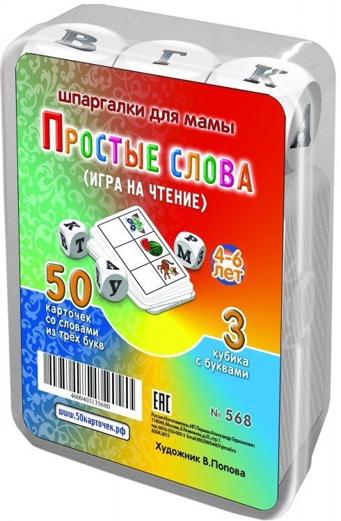 Состав: 50 красивых карточек с 3 рисунками предметов на каждой, 3 игровых кубика с буквами.