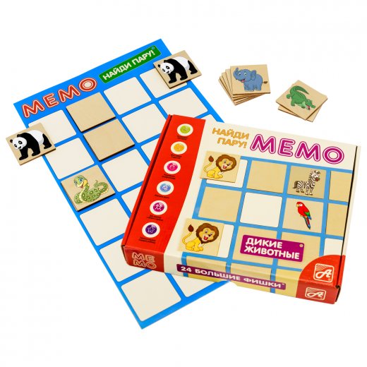 Настольная игра "Мемо Дикие животные" - настольная развивающая игра, направленная на развитие памяти и внимательности ребенка. Игра рассчитана на 1-3 игроков.