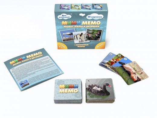 Мемо игра для малышей "Мими Мемо. Птицы" - познавательная игра для тренировки визуальной памяти, расширения кругозора и словарного запаса. Это классическая игра мемори с парными карточками. На карточках изображены фотографии морских обитателей с детенышами. Такие милые фотографии часто называют мимимишными, отсюда и приставка к названию игры.