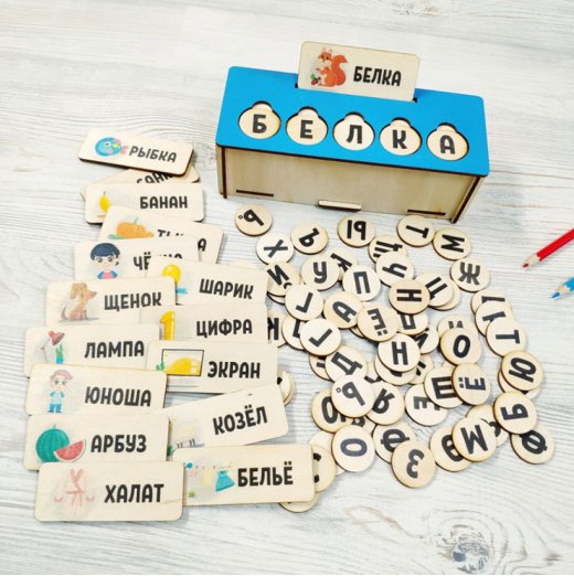 В набор также входит 66 фишек с буквам и 16шт. плашки-карточки с изображениями и словами с буквами на разные темы: животные, игрушки, одежда. На каждой такой плашке-карточке размещены картинка и слово. Ребенку нужно подобрать для карточки верную прорезь и вставить нужную фишку-букву во внутрь, чтобы получилось слово.