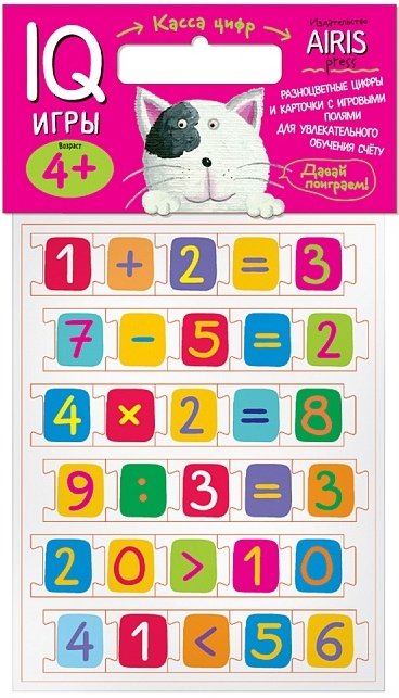 Игры IQ Касса цифр – это интересное и познавательное занятие для  юного разума.  Набор цветных фишек с игровыми листами предназначен для обучения детей счёту. С его помощью можно проводить всевозможные развивающие игры, в ходе которых малыш познакомится с цифрами и математическими знаками, научится считать и сравнивать, подбирать числа и математические выражения к картинкам. Для активизации и закрепления знаний в наборе приложены рабочие листы - игровые поля, на которых дети сами могут выполнить увлекательные задания. Карточки оформлены ярко и красочно, поэтому они несомненно привлекут внимание ребенка и надолго увлекут его в игровой процесс.