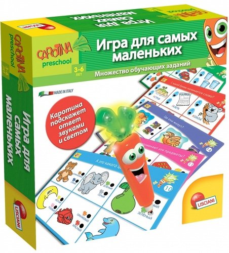 "Игра для самых маленьких 3-6лет" - это сборник увлекательных и интересных заданий, которые помогут развить у малыша логическое мышление, внимательность, усидчивость, а также расширят его кругозор и словарный запас. В набор "Игра для самых маленьких" входят 8 ярких двухсторонних карточек с 16 заданиями и ручка-тестер "Волшебная Морковка Каротина".