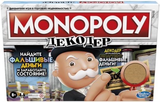 В настольной игре Монополия "Декодер" все не то, чем кажется - кто-то добавил фальшивые деньги и поддельные карты шанса! Для разоблачения игроков с поддельными банкнотами используются монеты обвинения! Названия и логотипы Hasbro, Hasbro Gaming, Parker Brothers и Monopoly, отличительный дизайн игровой доски, четыре угловых квадрата, имя и символ Мистера Монополии, а также каждый из отличительных элементов доски и игровых фигур являются товарными знаками компании Hasbro.