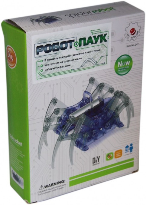 Детали робота паука изготовлены из высококачественного пластика, в комплект входит электрический двигатель и комплект необходимых проводов, а питание осуществляется при помощи батареек типа АА.