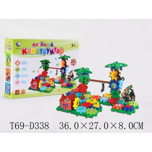 "Конструктор на батарейках" позволяет создать необыкновенный макет красочных джунглей с пальмами и обезьянами. Яркие детали, напоминающие шестеренки, соединяются друг с другом, оставаясь подвижными. Когда все элементы будут соединены в определенном порядке, необходимо повернуть специальный рычажок - и фигурки начнут двигаться под музыку, оживляя джунгли с их обитателями. Собранная конструкция может приводиться в движение благодаря батарейкам или ручному приводу.