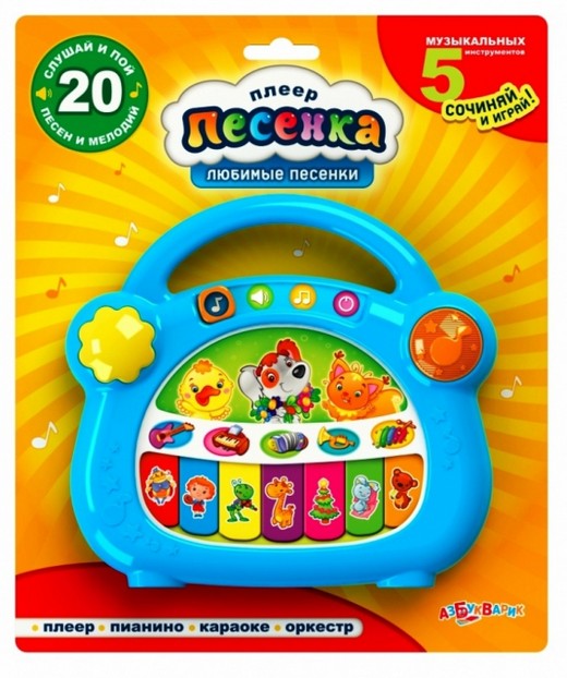 У вашего малыша обязательно должна быть эта замечательная игрушка – плеер ПЕСЕНКА! Нажимая на кнопочки, можно послушать целых 10 любимых песен. Ещё в плеере есть функция караоке и малыш с большим удовольствием будет петь. Но это ещё не всё! В нашей суперигрушке есть оркестр с пятью музыкальными инструментами, на которых можно играть, а также с их помощью придумывать свои мелодии. Плеер ПЕСЕНКА – лучшая музыкальная игрушка! "