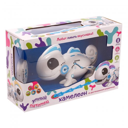 Белоснежный хамелеон умеет передвигаться и добывать себе еду. Конечно, главная "фишка" хамелеона - это его необычный язык, совсем как у настоящего: он резко "выстреливает" им и хватает специальные фишки с изображением его любимой еды. После этого хамелеон отправляет фишку себе в рот. Кроме того, игрушка издаёт забавные звуки, делая процесс управления ещё более занимательным и интересным.