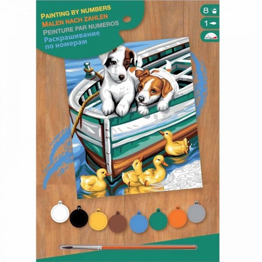 Для того чтобы нарисовать красивую картину, не обязательно быть именитым художником. С раскраской по номерам "Щенки и утята"  ребенок сможет создать настоящее произведение искусств и украсить им комнату. Все фрагменты изображения пронумерованы, все, что нужно - это закрасить их красками из набора, используя кисточку, которая тоже входит в комплект. А подробная инструкция поможет все сделать правильно.