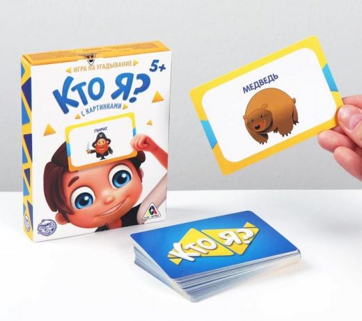 Перед вами новая версия популярной игры «Кто я?». Здесь вместо слов на карточках нарисованы картинки, чтобы играть могли даже те, кто не умеет читать! Задавайте вопросы и угадывайте, что изображено на вашей карте.