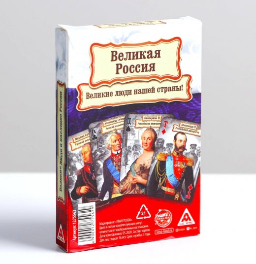 Попробуйте классическую колоду в новом исполнении. Перед вами колода, состоящая из 36 карт выполненных из картона с обозначениями значений по 2 углам. Еще на каждой карте изображены исторические личности и указаны даты знаменательных открытий. Такое оформление позволит вам не только насладиться состязанием, но и узнать много нового об изобретениях и русских деятелях. Существует множество карточных игр, знакомых нам всем. С этими каждая игра позволит почувствовать сладкий вкус победы!