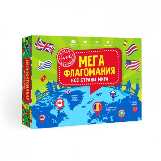 Настольная игра «Мегафлагомания» – расширенная настольная версия легендарной игры «Флагомания». Игра поможет познавать мир с азартом и радостью, и для этого есть всё, что нужно: 4 сценария, карточки с флагами всех 197 стран (страны, официально признанные РФ) и большая ламинированная карта мира.