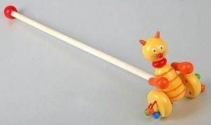 Привлекательная и яркая каталка на палочке "Кошка" для малыша будет увлекательным спутником на прогулке, а так же станет веселой забавой для игры дома. Игрушка представляет собой каталку-кошку с деревянными бусинками на колесиках, которые мелодично постукивают при движении. Возить игрушку можно как перед собой, так и за собой. Поначалу это будет трудно. Малыш будет пытаться всегда идти спиной, чтобы видеть движение каталки. Помогите ему, объясните, что можно идти вперед, а она будет ехать за ним. Часто дети, везя за собой каталку, слишком высоко поднимают ее и она опрокидывается. Но со временем ребенок сможет наладить координацию своих движений и ловко начнет справляться с игрой! Каталку можно разобрать - деревянная палочка откручивается. Малыш может просто поиграть с игрушкой пчелкой. Каталка на палочке "Кошка" выполнена из высококачественной древесины, и все ее элементы покрыты безвредной акриловой краской.
