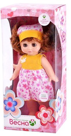 Кукла Настя обязательно украсит и разнообразит кукольную коллекцию любой девочки. Куколка выполнена в лучших традициях российского бренда "Весна" и немного напоминает кукол советского производства. У Насти большие карие глаза с пушистыми и длинными ресницами, густые прошивные волосы аккуратно убраны в платочек. Куколка одета в яркое и симпатичное платьице, на ножках у нее - светлые сандалии. Кроме того, Настя еще и умеет говорить! Кукла произносит несколько фраз: Мама, Почитай мне книжку, Давай поиграем, Есть хочу, Хочу спать.