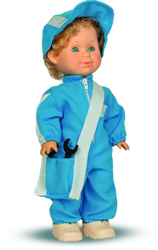В комплект одежды куклы входит: комбинезон, кепка. Комплект дополняют кроссовки и сумка с инструментами из пластмассы