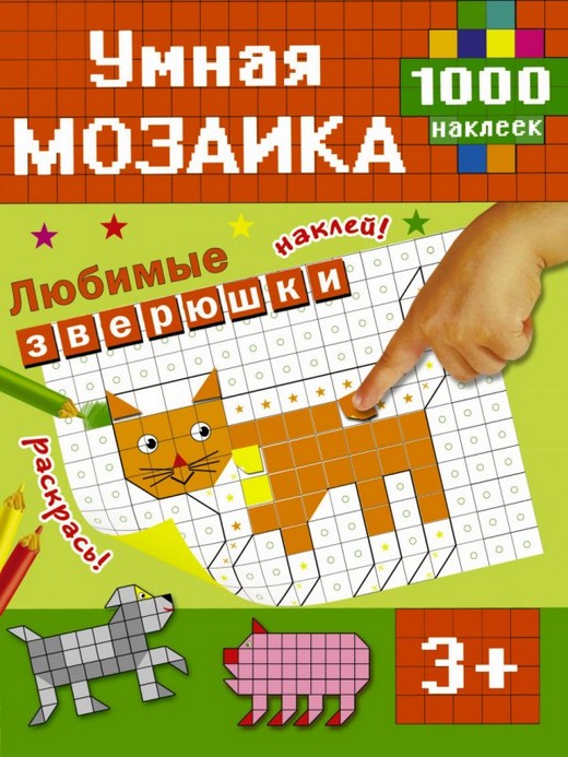 Составление мозаик из книги «Любимые зверушки» – это увлекательная игра для всей семьи. Создавая аппликации из разноцветных геометрических стикеров вместе с ребёнком, вы поможете малышу проявить свои творческие способности, развить мелкую моторику и пространственное мышление, научиться внимательности, аккуратности и усидчивости. Складывать мозаику – не только весело и интересно, но и очень полезно для творческого и интеллектуального развития ребёнка. Для дошкольного возраста.