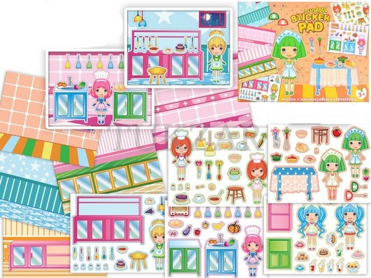 Альбом с многоразовыми наклейками "Моя кухня". Прекрасный подарок для маленьких хозяек. Альбом состоит из пяти листов. На каждом листе представлена девочка-хозяйка и различная кухонная мебель, посуда, продукты. Игра развивает мелкую моторику, очень красочный и оригинальный.