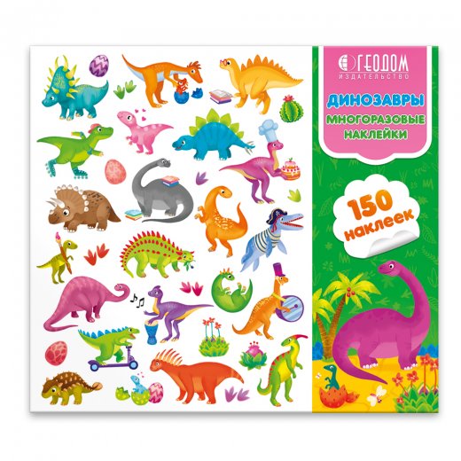 Набор из 150 ярких многоразовых наклеек на любимую тематику мальчишек и девчонок - "Динозавры" упакован в удобную папку, что позволяет не расставаться с ними и брать с собой куда угодно: к бабушке, в садик, в самолёт и в гости.