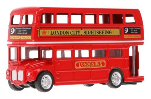 Уменьшенная модель лондонского двухэтажного автобуса отличается тщательной проработкой деталей. На первом этаже автобуса имеется миниатюрная кабина водителя, на обоих этажах расположены пассажирские сиденья. В игрушке есть инерционный механизм движения – pull back. Чтобы отправить машину в самостоятельное путешествие, нужно сперва откатить ее назад, на небольшое расстояние, а затем отпустить.