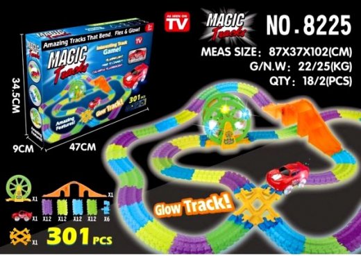 В этом конструкторе 301 деталь. Трек для машин флуоресцетный, светится в темноте. Данная игрушка принесет много положительных эмоций вашему ребенку и станет прекрасным подарком на любой праздник.