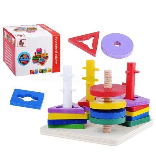 Игрушка представляет собой квадратное основание, на котором располагаются четыре пирамидки разной конфигурации - круглая, квадратная, треугольная, прямоугольная. Играя, нужно продеть элементы таким образом, чтобы обойти все выступы на штырьках. Количество выступов соответствует количеству отверстий на фигурках. Собрать пирамидки непросто. Собирая эти пирамидки, ребенка можно научить счету, пересчитывая количество фигурок в одной или нескольких пирамидках.