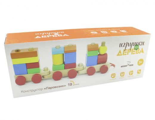 Конструктор "Паровоз" – это яркий разноцветный конструктор, изготовленный из экологически чистой древесины. Конструктор состоит из 19 окрашенных деталей, которые надо разместить на трех платформах с колесиками и штырями. Ребенок сможет менять расположение деталей, а также сделать из собранного конструктора каталку. Для этого надо лишь привязать веревочку к собранному паровозику. Малыш вначале использует паровоз как каталку - тянет его за веревочку. Со временем он поймет, что есть штырьки на вагончиках и дырочки на геометрических фигурках, начнет надевать и снимать фигурки разной формы со штырьков. Затем он будет собирать по цветам (красный, зеленый, желтый, синий), т.е. появятся и закрепятся знания об основных цветах. Постепенно, с первыми словами ребенок будет использовать паровоз для сюжетно-ролевых игр, что способствует развитию речи. Конструктор "Паровоз" выполнен из экологически чистой древесины и раскрашен нетоксичными красками вручную.