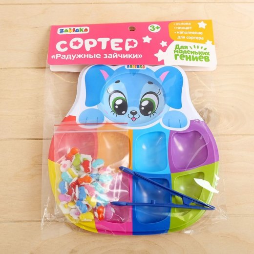 Сортер "Радужные зайчики" – игра создана для тренировки мелкой моторики, обучению цветам и счёту. Малыш сначала пальчиками, а потом с помощью пинцета будет раскладывать "конфетки" по отделениям. Процесс можно усложнять, добавляя новые задания.