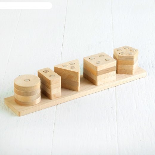 Геометрический сортер "Пирамидка" - это увлекательная игра для Вашего малыша, которая будет развивать полезные навыки. В комплект входит деревянная доска с 15 колышками и 20 разных геометрических деталей.