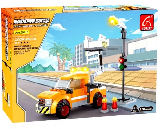 Конструктор Ausini Строители Электросеть – познакомит ребенка с видом специальной техники, применяемой для ремонта светофоров и уличных фонарей. В комплект набора входят детали для сборки машины с вышкой, светофора с фонарем, дорожные знаки и фигурки рабочих. Мальчик сможет моделировать сюжет ремонтных работ на автотрассе, ограничивая движение машин и позволяя им вновь двигаться.