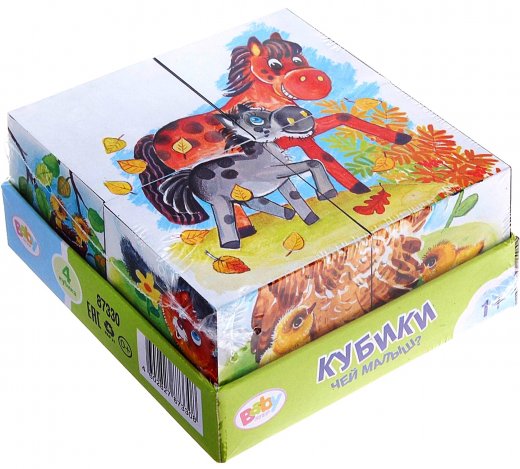 Кубики Чей малыш 4 шт – это замечательный подарок для ребенка, который несомненно ему понравится. Все маленькие дети с удовольствием играют с кубиками. А также смотрят добрые мультфильмы. Набор из 4 кубиков "Чей малыш" совмещает в себе и то и другое. Такая игрушка будет ребенку и полезной и приятной. В комплект с кубиками входят специальные красочные вкладыши, по которым ребенок без труда освоит сборку картинки. Размер кубика специально сделан для детской ручки. Кубики приятны на ощупь и радуют глаз. Такими кубиками ребенок может просто играть или строить домики, дороги или препятствия и т.д., или как дополнительные здания при игре с другими игрушками, в общем игр и применений для кубиков можно придумать множество.