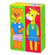 Познакомьте ребенка с названиями животных, расскажите ему, какую пользу они приносят человеку, чем питаются, как "разговаривают" и так далее - это способствует обогащению активного словаря вашего малыша.В процессе игры ребенок познакомится с понятиями "часть и целое", научится работать по образцу. Вначале вы помогаете собирать картинку, а вскоре малыш составляет ее самостоятельно. Комментируйте его действия, используйте слова "справа", "слева", "вверх", "вниз" и другие. Например: "Место этого кубика - внизу справа". Так ребенок учится ориентироваться в пространстве. Из кубиков Мякиши можно строить и обычные башенки, а также использовать картинки как декорации для других игр.