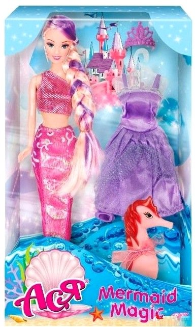 Кукла Ася "Волшебная Русалочка" – очаровательная блондинка, которая из русалочки способна превратиться в обычную куклу. Для этого стоит всего лишь сменить одежду! В наборе малышка найдет фиолетовое платье, туфли на высоком каблуке, диадему, хвостик русалки, фигурку морского конька. С такой куколкой малышка сможет придумать множество сюжетов для интересных игр, например, сначала отправиться покорять подводный мир, а поменяв костюм русалочки на платье, пойти на вечеринку или свидание.